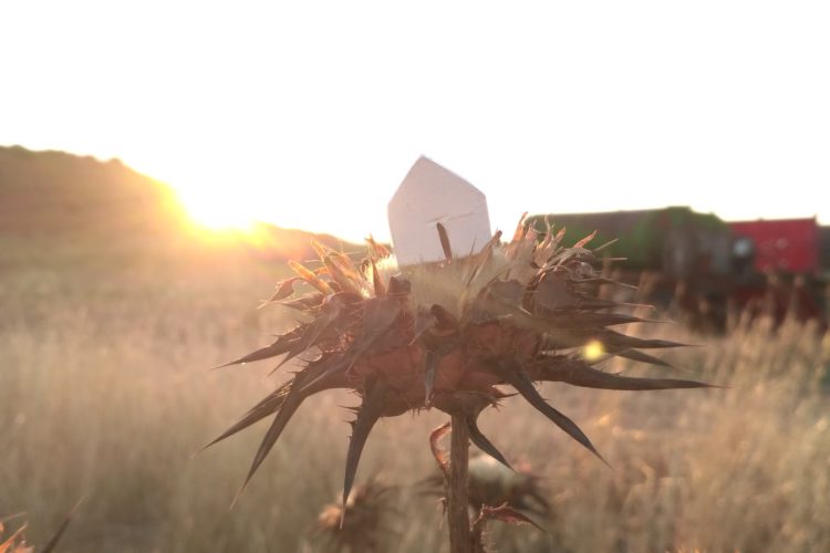 Flor de hogar con espinas. Intervenciones efímeras en espacios naturales. Foto digital. Celadas, Teruel, 2020 Sol y espigas al lado del camino.